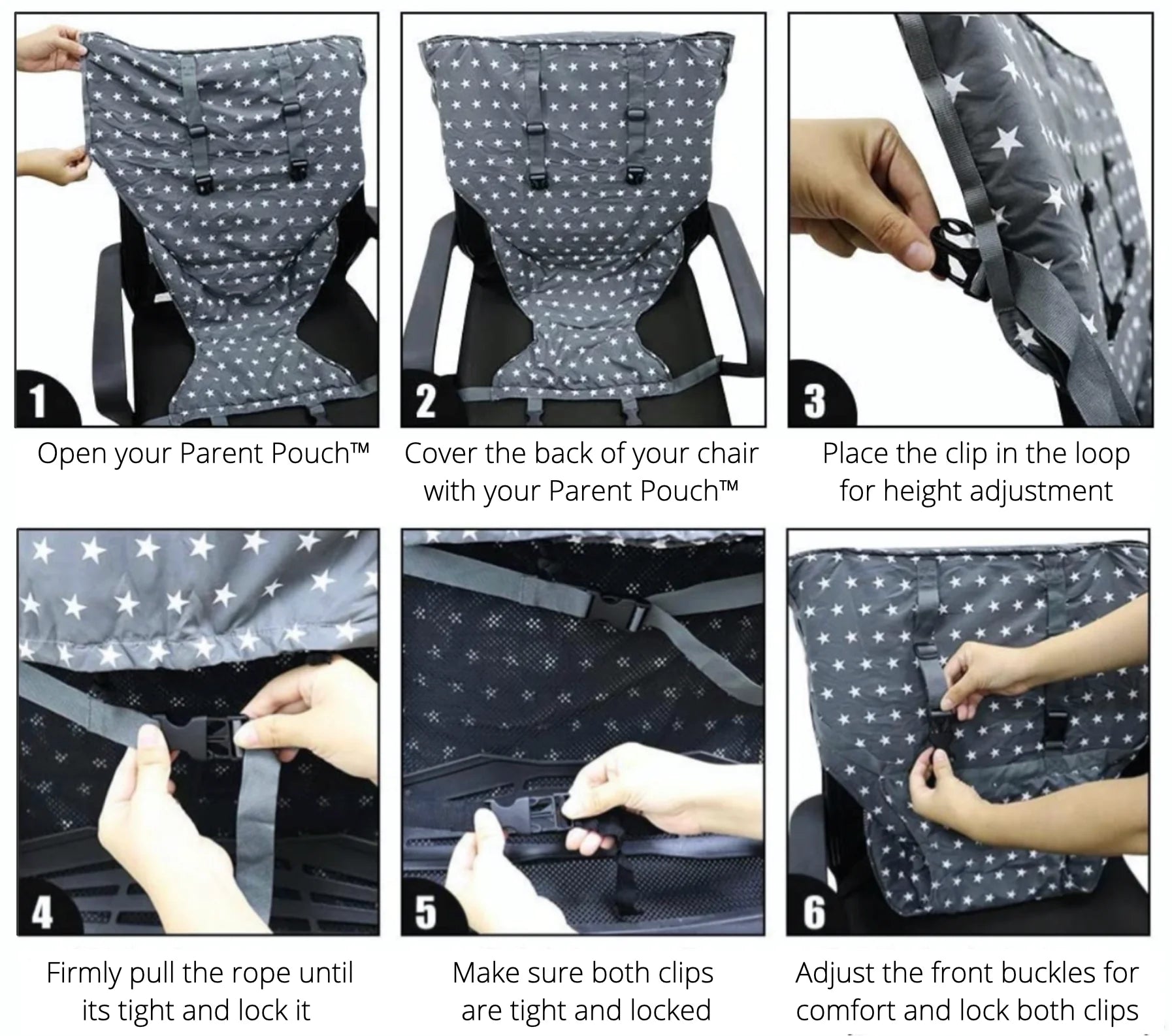 - Adjust Parent Pouch™on the back of the chair by pulling or loosening the strings and or strap.